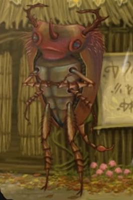 The Bar Guard appears as an anthropomorphic rhinoceros beetle with a scorpion's tail. He has three horns and his carapace is a reddish brown color.